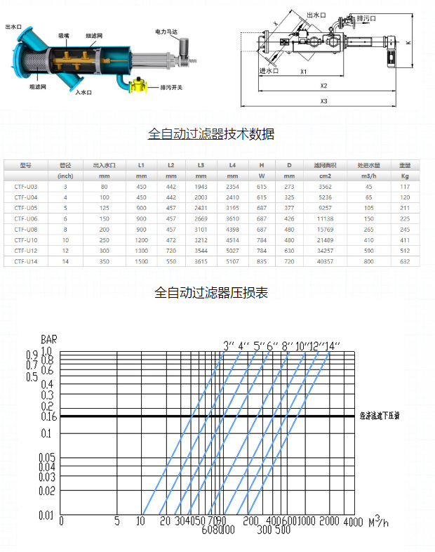 技術參數 單臺處理水量: 1040-4160m/h 最大工作壓力: 0.1-1.6Mpa 過濾器清潔時的壓力損失: 0.018Mpa 最高工作水溫: 95℃ 過濾精度范圍: 100-3000m 自清洗所需水量: 1% 自清洗時間: 10-60秒